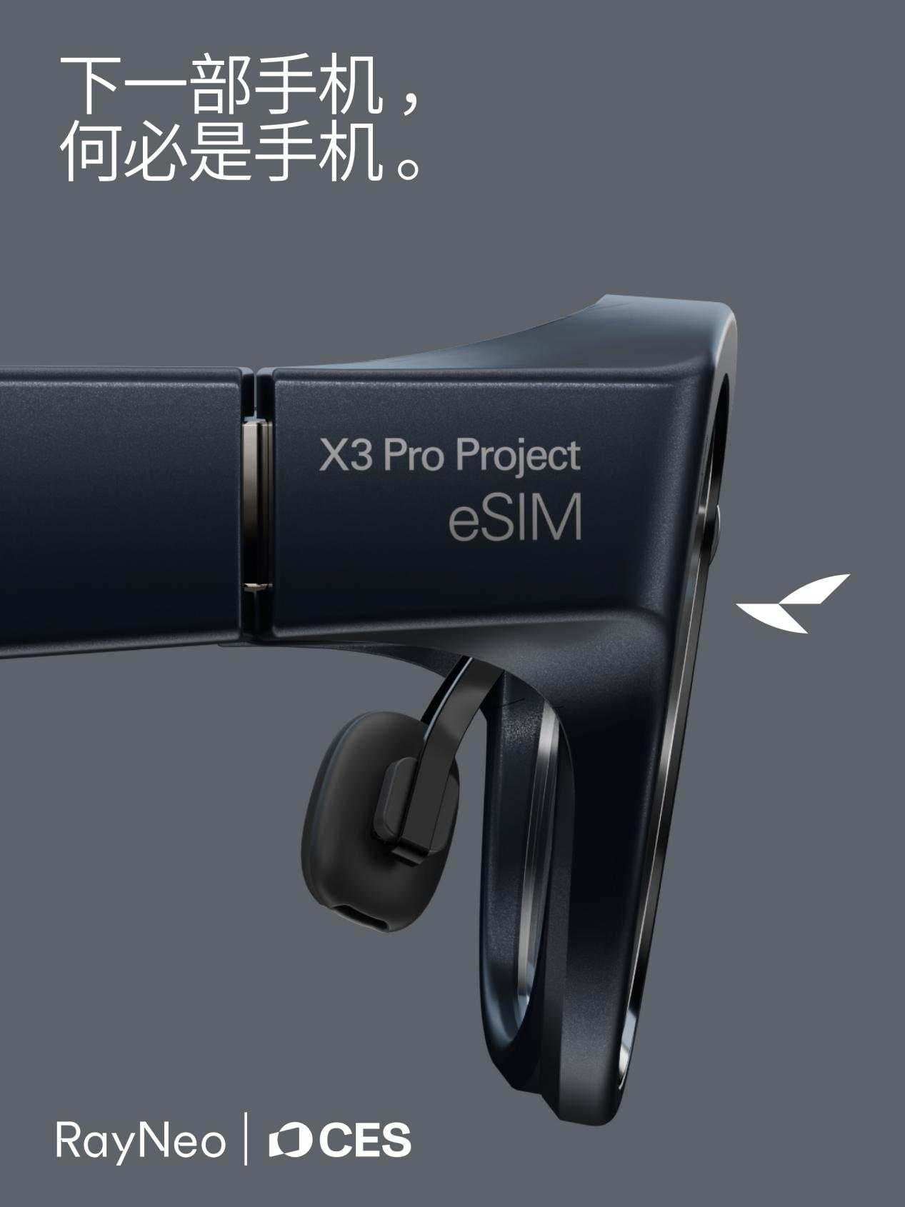 同期,雷鸟创新预告,将于CES 2026期间展示首款搭载eSIM的AR智能眼镜“雷鸟X3 Pro Project eSIM”,产品采用双目全彩MicroLED显示方案、集成了 eSIM 通信模块与4G 协议支持,展示智能眼镜的完整形态。