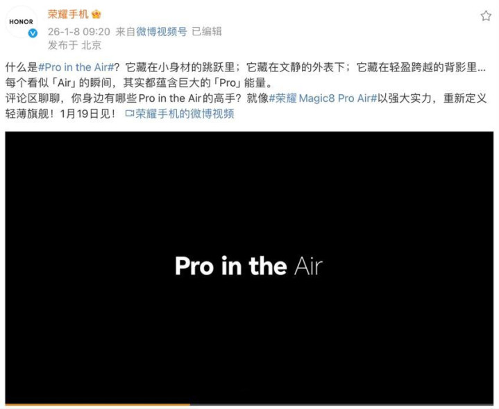 荣耀Magic8系列即将在1月19日补齐两款新机型,一边是155g重的极致轻薄小直屏Pro Air,一边是拉满堆料的保时捷设计RSR超大杯。这两款机型的到来,会不会让高端旗舰市场的细分赛道彻底内卷?